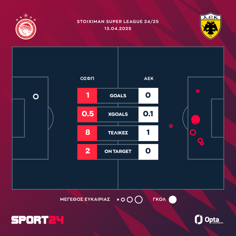 Το γκολ αυτό ήταν αρκετό για τον Ολυμπιακό ώστε να κερδίσει για τρίτη φορά φέτος την Ένωση στο “Γ. Καραϊσκάκης”, να πάρει τους τρεις βαθμούς, φτάνοντας τους 66 και να πανηγυρίσει και μαθηματικά τον τίτλο με την ολοκλήρωση των τριών πρώτων αγωνιστικών των playoffs.