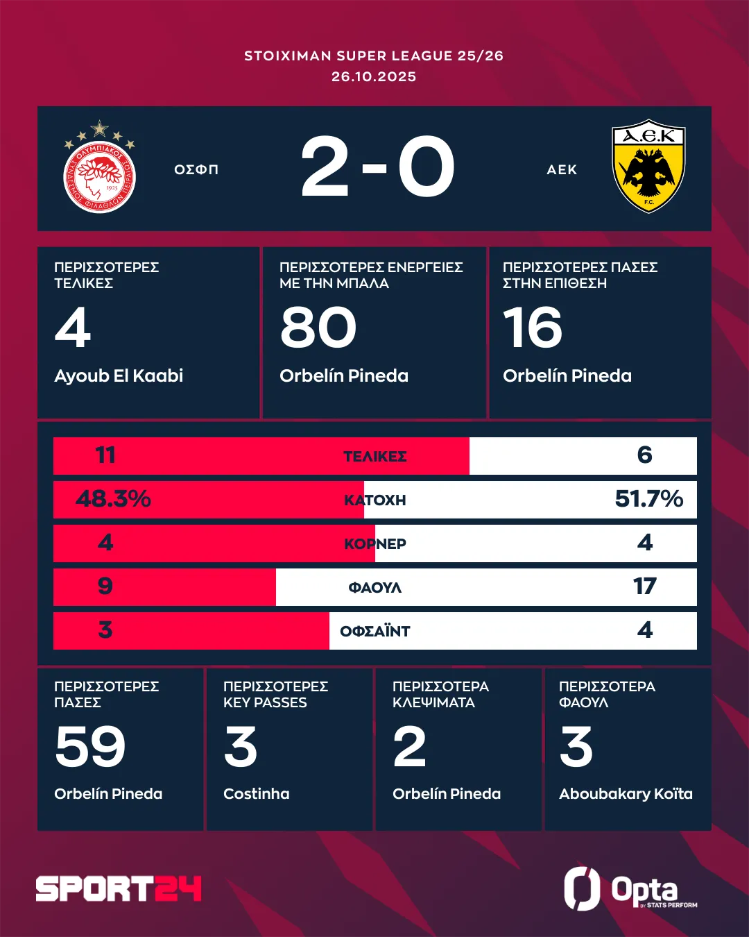 Την επόμενη αγωνιστική ο Ολυμπιακός υποδέχεται τον Άρη στο Καραϊσκάκης (1/11, 20:00), ενώ η ΑΕΚ φιλοξενεί τον Παναιτωλικό στην OPAP Arena (2/11, 21:00).