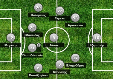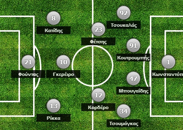 Ολυμπιακός (Μίτσελ Γκονθάλεθ): Μέγιερι, Παπάζογλου, Μανωλάς, Α. Παπαδόπουλος, Χολέμπας, Μανιάτης, Φέισα, Γκρέκο (38′ Μασάντο), Αμπντούν, Βλαχοδήμος (65′ Ιμπαγάσα, 74′ Φουστέρ), Τζιμπούρ.