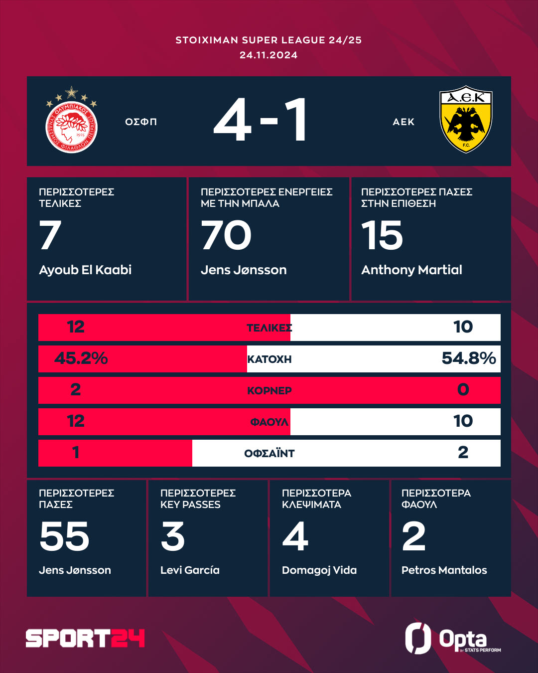 Ο Ολυμπιακός σκόρπισε την ΑΕΚ, επικρατώντας 4-1 στο ντέρμπι της 12ης αγωνιστική της Stoiximan Super League. Απόλυτος πρωταγωνιστής ο ασταμάτητος Ελ Κααμπί, που πέτυχε χατ-τρικ (7', 49', 51'). Το τέταρτο γκολ των ερυθρόλευκων πέτυχε ο Μαρτίνς (62'), ενώ είχε ισοφαρίσει προσωρινά ο Μαρσιάλ (43'). Στην πρώτη θέση οι Πειραιώτες.