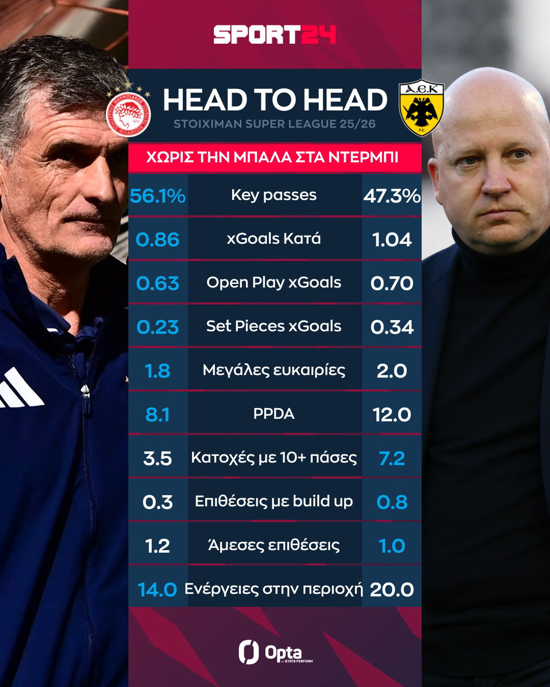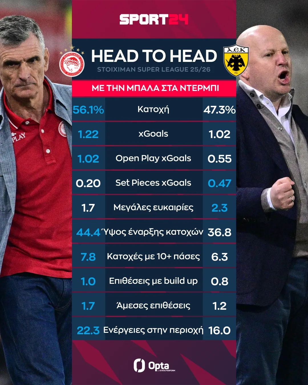 Αρχικά, οι ερυθρόλευκοι κρατούν περισσότερο την κατοχή σε σχέση με την ΑΕΚ. Συγκεκριμένα έχουν 56.1% μέσο όρο έναντι 47.3%. Οι δύο ομάδες βρίσκονται κοντά όσον αφορά την απειλή με τον Ολυμπιακό βέβαια να υπερέχει με 1.22xG έναντι 1.02 της Ένωσης.