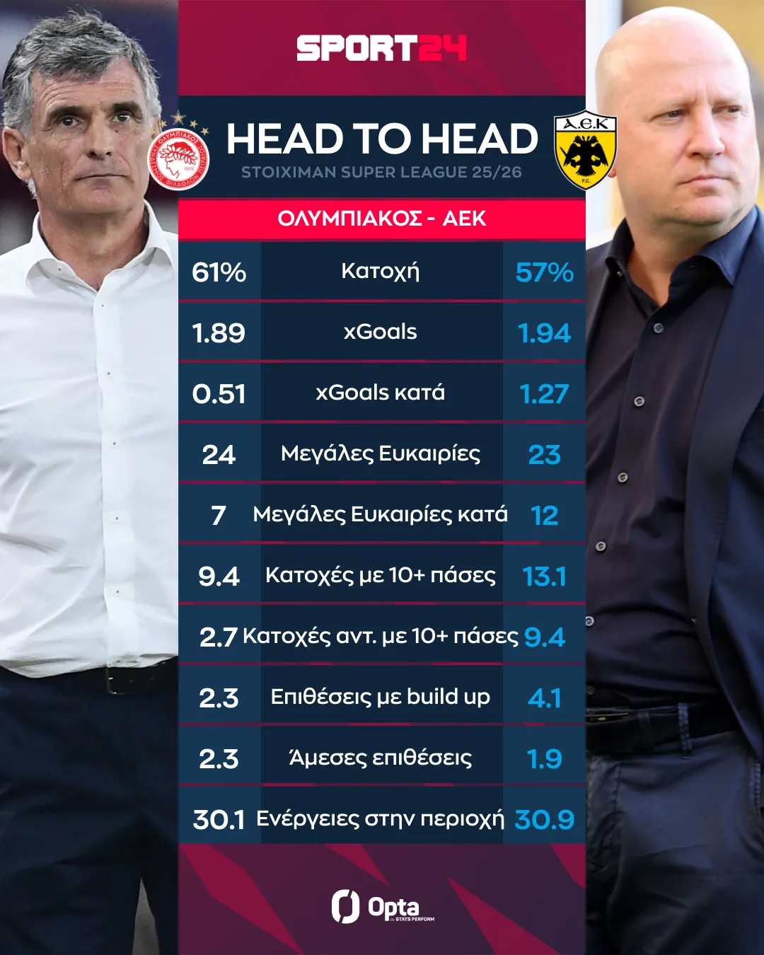 Το SPORT24 καταγράφει την αγωνιστική φιλοσοφία των δύο ομάδων με τα πεπραγμένα τους στο ελληνικό πρωτάθλημα με τη βοήθεια της Opta Stats/Perform, βάζοντας ως δεδομένο ότι ο Ολυμπιακός έχει δώσει δύο ντέρμπι και η ΑΕΚ ένα.