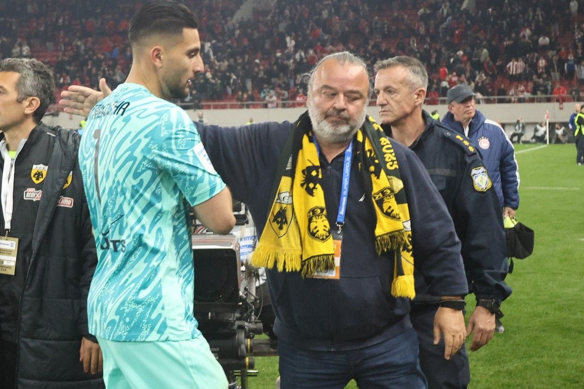 Ο Μάριος Ηλιόπουλος παρακολούθησε την αναμέτρηση της ΑΕΚ με τον Ολυμπιακό από το Καραϊσκάκης και μάλιστα μετά την ολοκλήρωση του αγώνα, κινήθηκε στα όρια του αγωνιστικού χώρου με το κασκόλ του προκειμένου να συγχαρεί τους παίκτες της Ένωσης και τον Μάρκο Νίκολιτς.