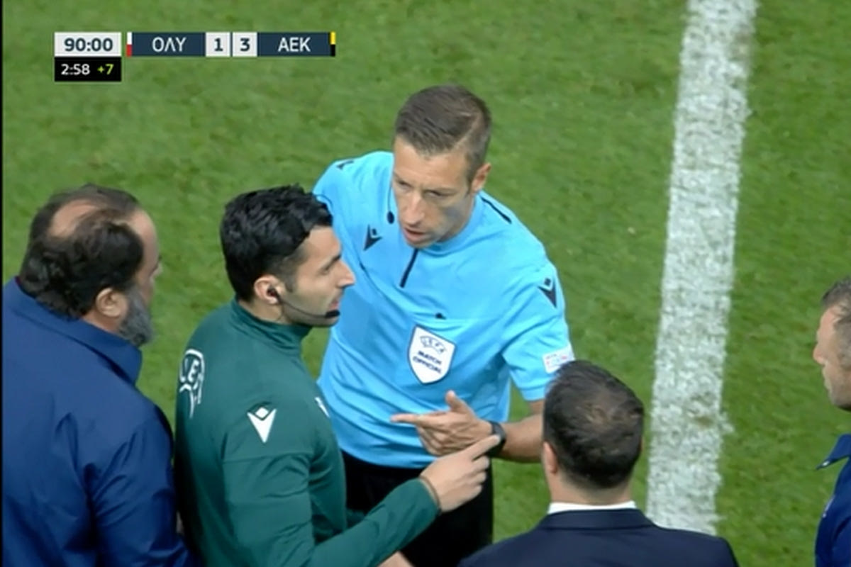 Το ίδιο συνέβη κι έπειτα από το τρίτο γκολ της ΑΕΚ, με τις διαμαρτυρίες του να απευθύνονται προς τον διαιτητή.