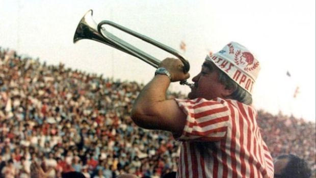 Ο Ατίλιο παίζει με την τρομπέτα του σε αγώνα του Ολυμπιακού