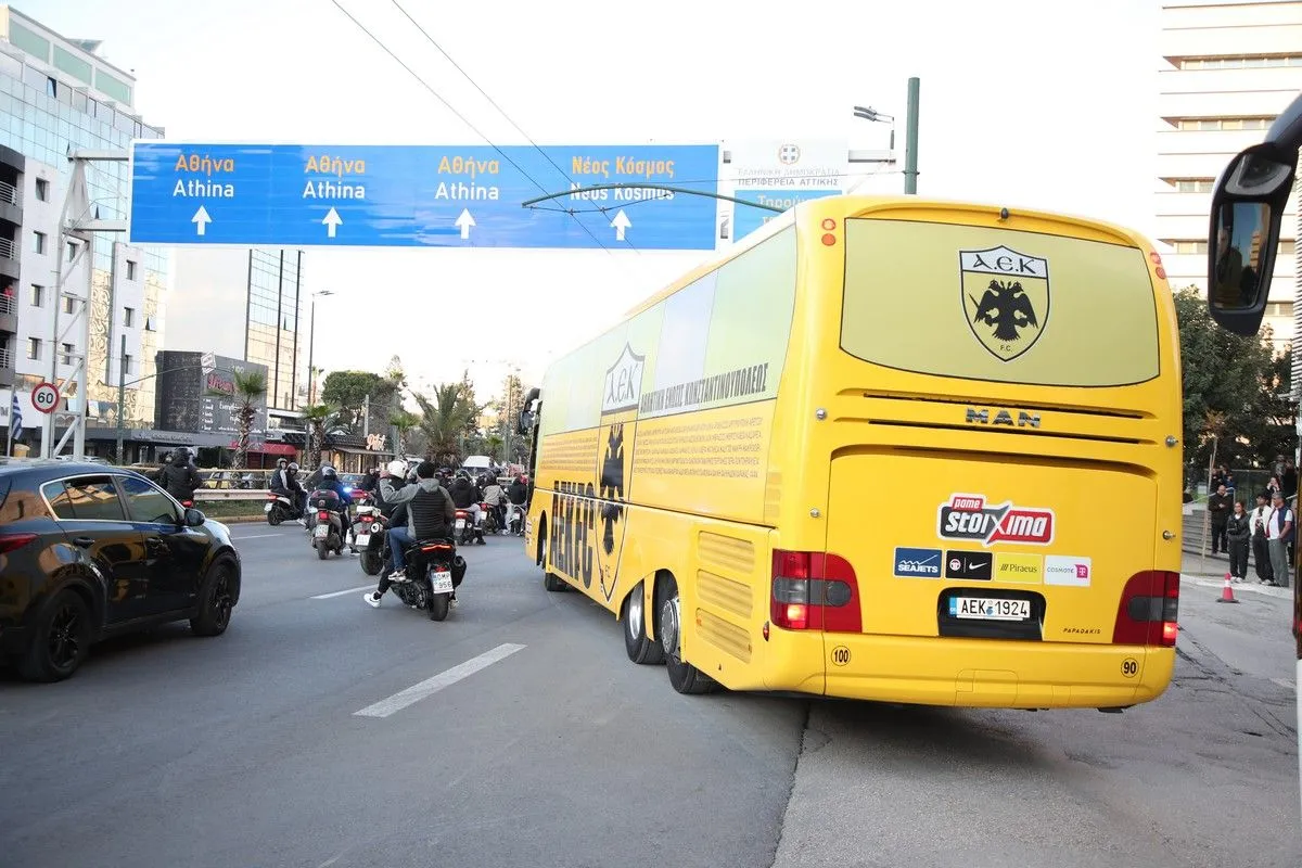 Οπαδοί της ΑΕΚ συγκεντρώθηκαν στο ξενοδοχείο που είχε καταλύσει η ομάδα του Μάρκο Νίκολιτς και έπειτα ακολούθησαν το πούλμαν με μηχανοκίνητη πορεία στην Συγγρού.