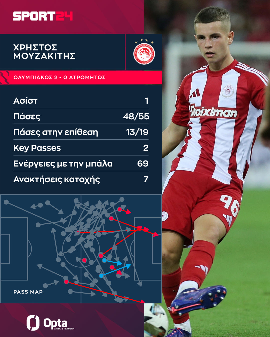 Ο 17χρονος Χρήστος Μουζακίτης ήταν εκ των κορυφαίων παικτών του Ολυμπιακού στη νίκη επί του Ατρομήτου (2-0) και έδειξε πως το μέλλον των ερυθρόλευκων είναι εδώ.