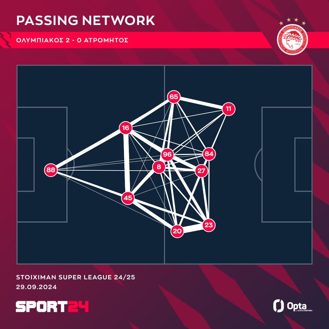 Ο Μουζακίτης αγωνίστηκε λοιπόν στη βάση της μεσαίας γραμμής, μαζί με τον Στάμενιτς, πίσω από τον Τσικίνιο. Στο γράφημα της Opta/Stats Perform μπορείτε να δείτε τον μέσο χώρο δράσης και το δίκτυο μεταβιβάσεων των ερυθρόλευκων.