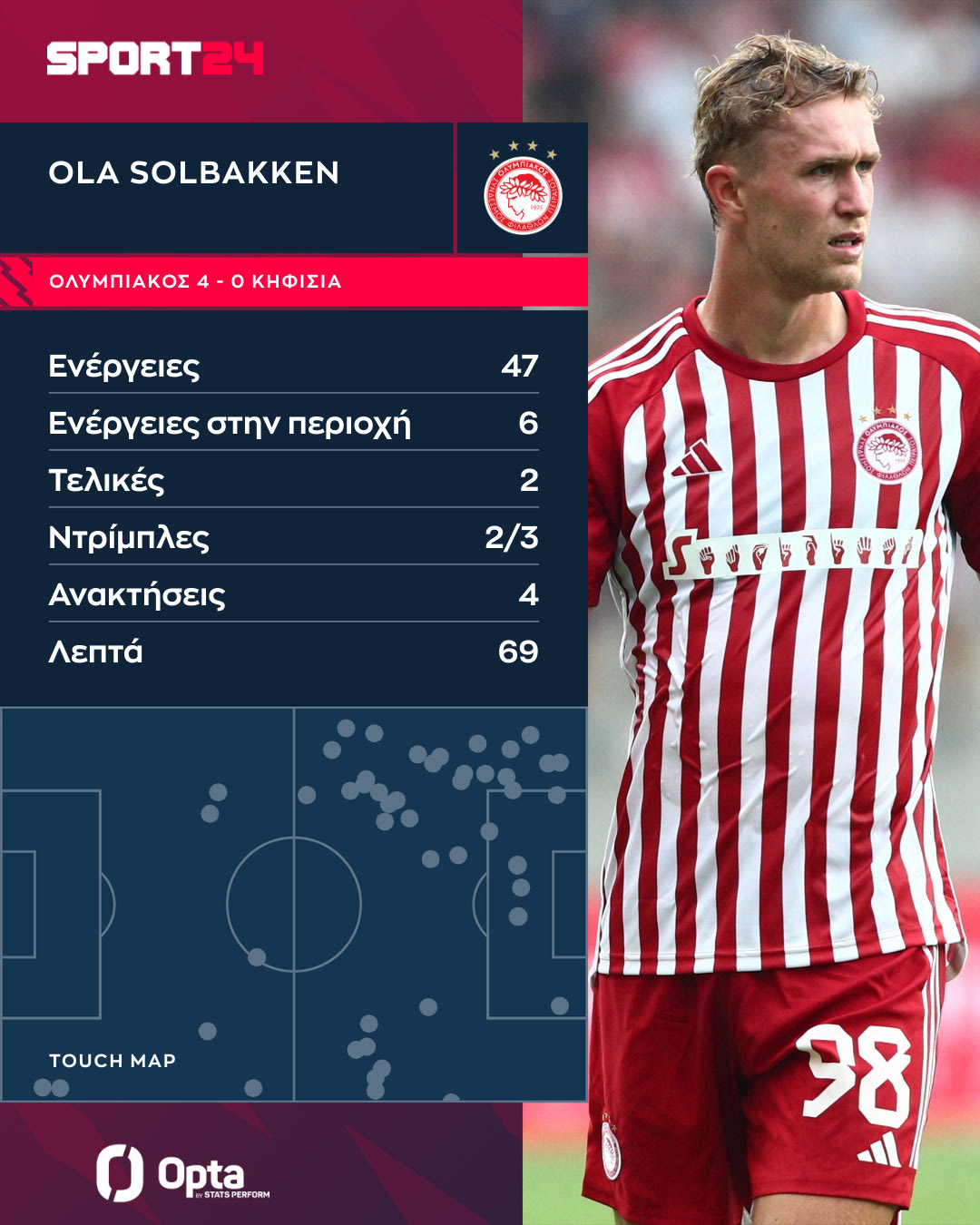 Ο Σολμπάκεν τοποθετήθηκε στην αριστερή πλευρά, όπου κινήθηκε κυρίως. Στο γράφημα της Opta/Stats Perform μπορείτε να δείτε όλες τις ενέργειες του Σολμπάκεν στην αναμέτρηση κόντρα στην Κηφισιά.