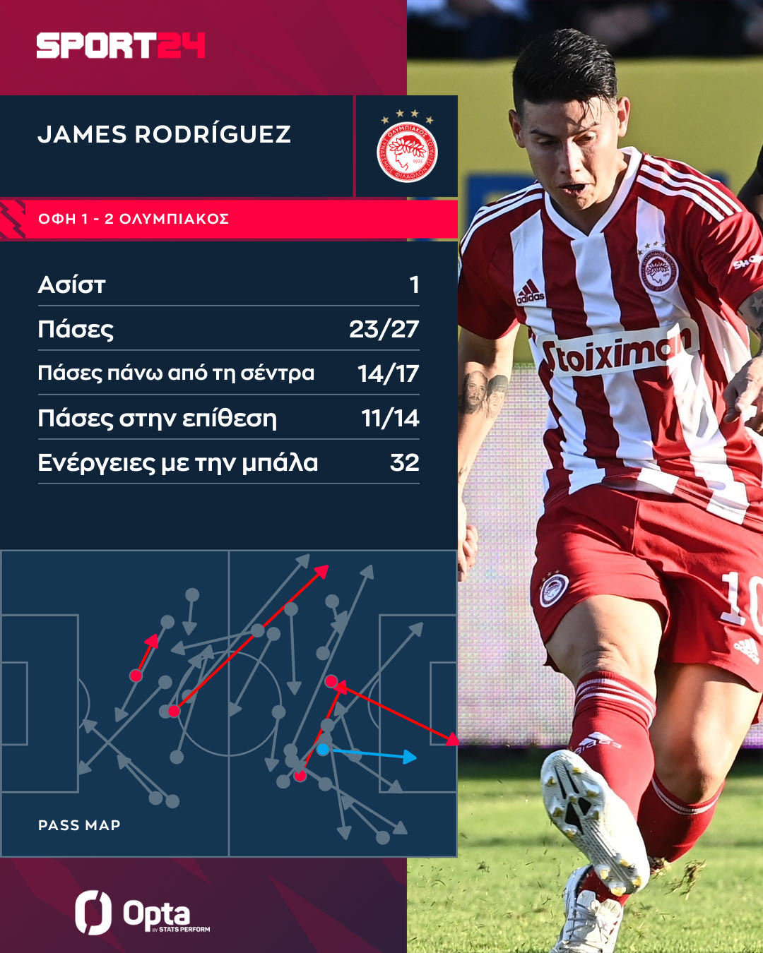 Ο Κολομβιανός σούπερ σταρ προσπαθούσε συνεχώς με τις μεταβιβάσεις του να δημιουργήσει καταστάσεις μπροστά από τα καρέ του κλεισμένου ΟΦΗ. Ήταν σχεδόν αλάνθαστος, κάτι που φαίνεται από τις 22 επιτυχημένες στις 27 συνολικά μεταβιβάσεις του, ενώ σχεδόν το 60% των πασών του ήταν προς τα μπροστά.