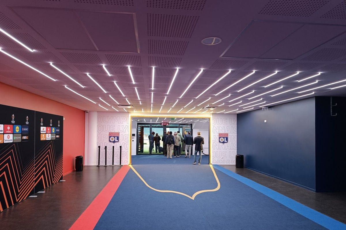 Το εσωτερικό του Groupama Stadium είναι πραγματικά δαιδαλώδες, με δεκάδες διαδρόμους και σκάλες, που δημιουργούν έναν λαβύρινθο. Η εικόνα επίσης που θα αντικρίσουν οι παίκτες πριν πατήσουν στον αγωνιστικό χώρο θα είναι ένας σύγχρονος χώρος, ντυμένος στα χρώματα της Λιόν.