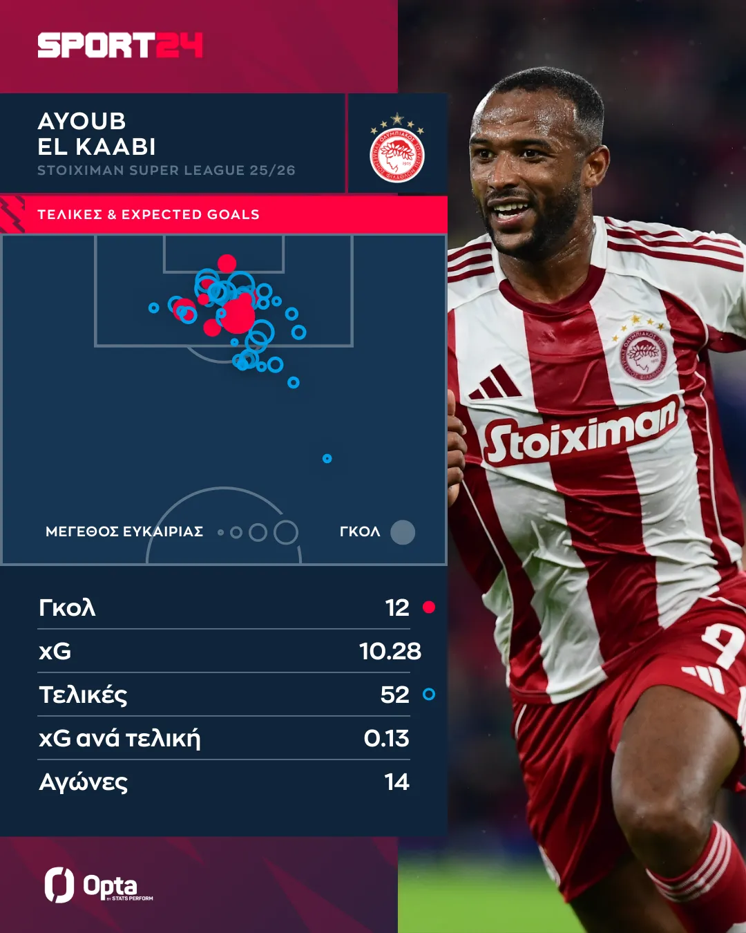 O Eλ Κααμπί είναι ο απόλυτος finisher του Ολυμπιακού. Στη Stoiximan Super League έχει πετύχει 12 γκολ, τα πέντε από την άσπρη βούλα. Έχει συνολικά 10.28xG και 6.34xG χωρίς να υπολογίζουμε τα πέναλτι. Έχει 52 τελικές με τις περισσότερες προσπάθειές του να είναι μέσα από την περιοχή.