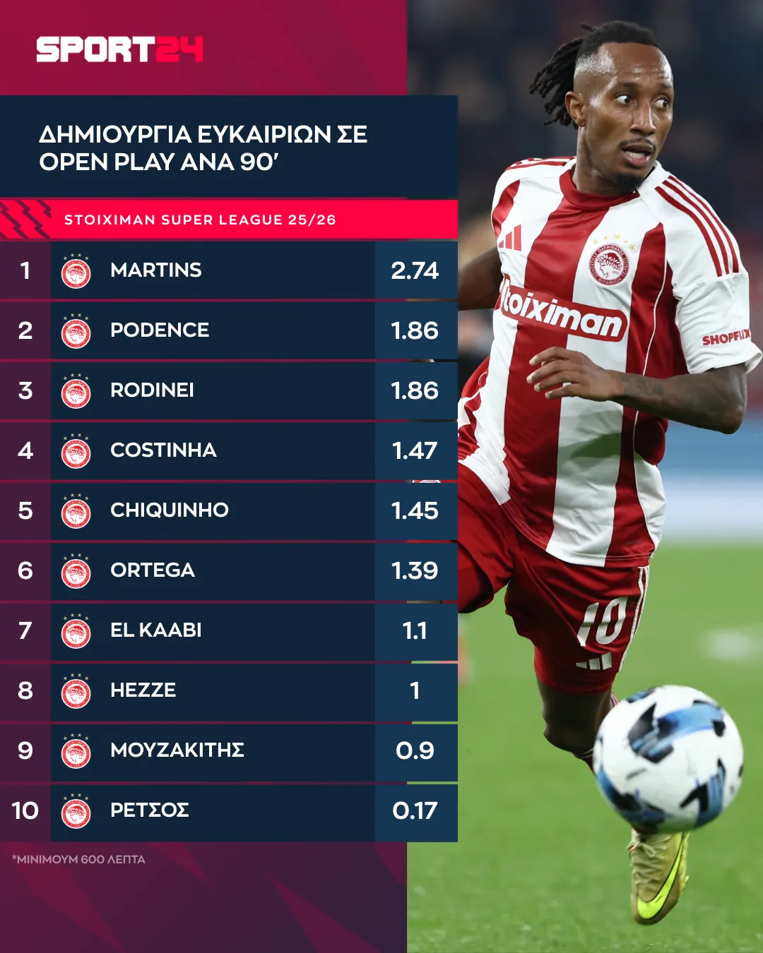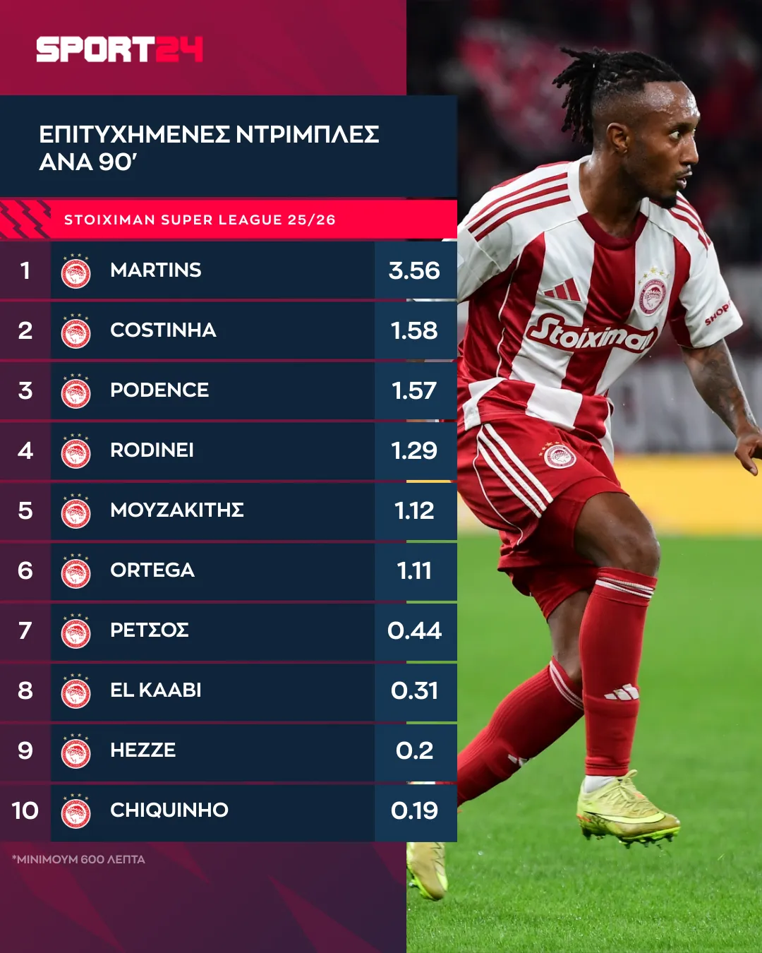 Ο κορυφαίος ντριμπλέρ του Ολυμπιακού στις 15 αγωνιστικές της Stoiximan Super League είναι ο Ζέλσον Μαρτίνς. Ο εξτρέμ των ερυθρόλευκων πραγματοποιεί 3.56 ανά 90λεπτο, κάτι που δικαιολογείται από τον τρόπο παιχνιδιού του. Συχνά πηγαίνει στο ένας εναντίον ενός, πότε στην πλευρά του, πότε παίζοντας πιο κεντρικά, αναζητώντας την δημιουργία χώρων. Ακολουθούν ο Κοστίνια (1.58) και ο Ποντένσε (1.57).