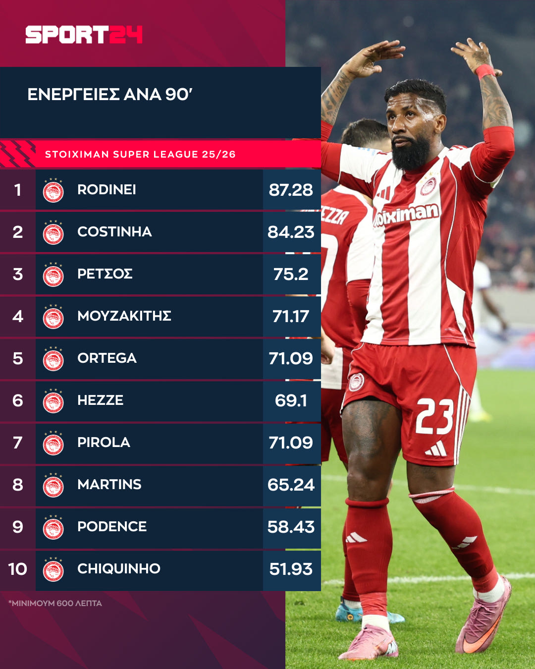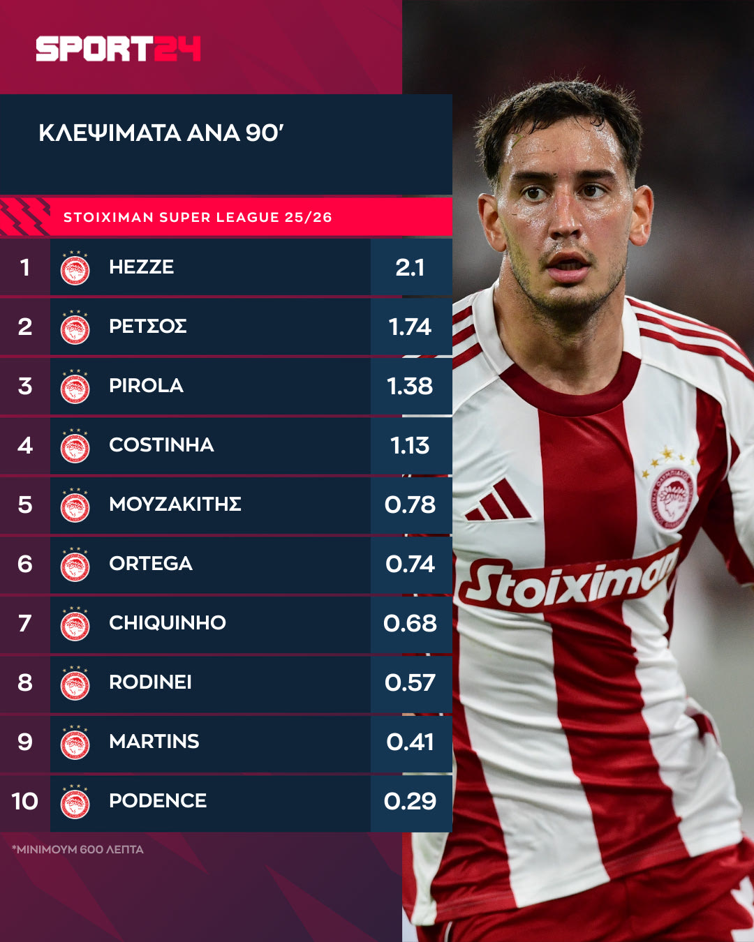 Τέλος, ο “μονομάχος” του Ολυμπιακού είναι ο Κοστίνια με 9.17 κερδισμένες μονομαχίες (εναέριες και στο έδαφος) ανά 90λεπτο, με τους Μαρτίνς (7.93) και Πιρόλα να συμπληρώνουν την κορυφαία τριάδα (7.28).