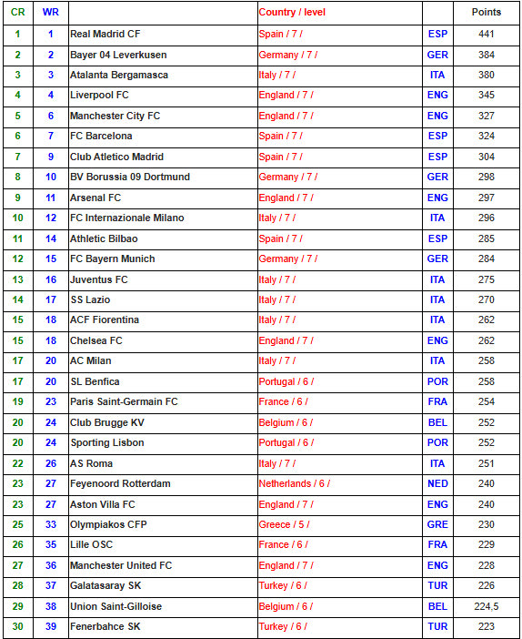 Την κορυφή της κατάταξης απολαμβάνει η Ρεάλ Μαδρίτης, ακολουθεί η Λεβερκούζεν, τρίτη η Αταλάντα, τέταρτη η Λίβερπουλ και την πεντάδα κλείνει η Μάντσεστερ Σίτι.