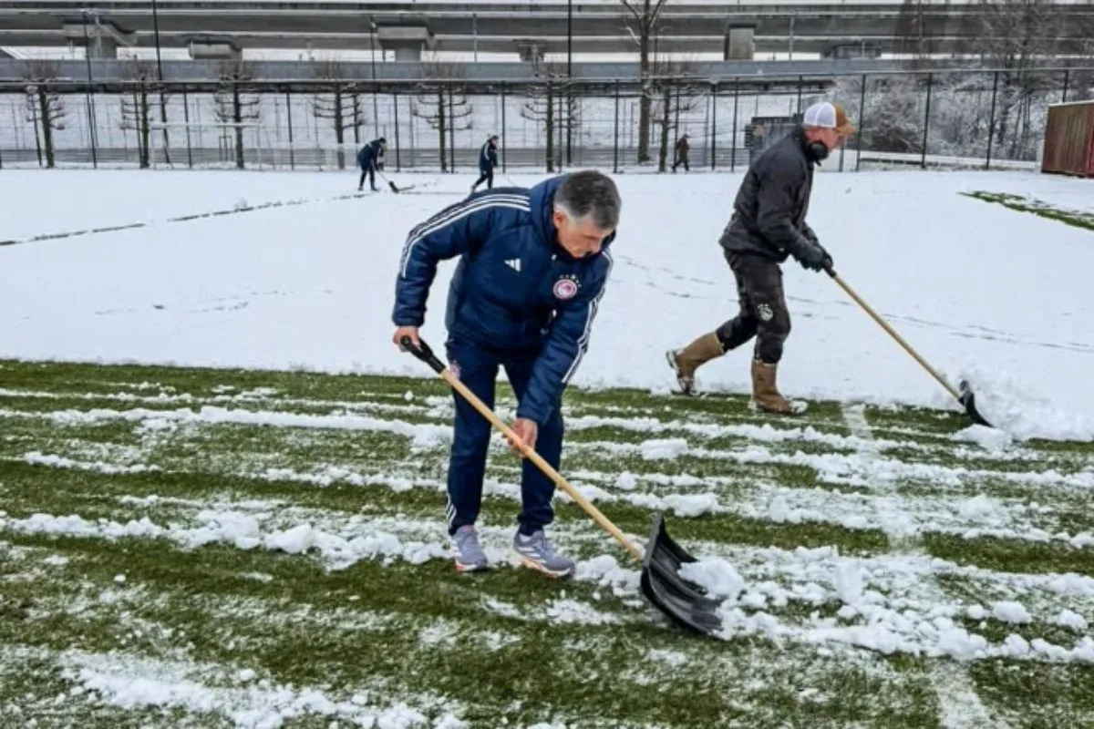 Η επόμενη ημέρα της σπουδαίας πρόκρισης του Ολυμπιακού στα playoffs του Champions League βρήκε τους ερυθρόλευκους να προπονούνται στο Άμστερνταμ σε χιονισμένο τοπίο, με τον Χοσέ Λουίς Μεντιλίμπαρ να παίρνει φτυάρι για να καθαρίσει τα χιόνια προκειμένου να πραγματοποιηθεί η προπόνηση της ομάδας του.