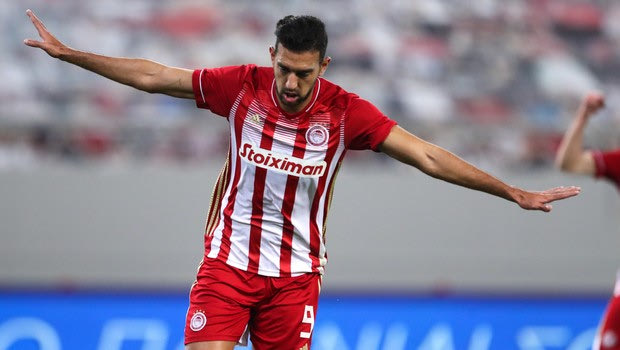 Ο Αχμέντ Χασάν πανηγυρίζει το γκολ που πέτυχε στον προημιτελικό του Ολυμπιακού με τον Άρη Eurokinissi
