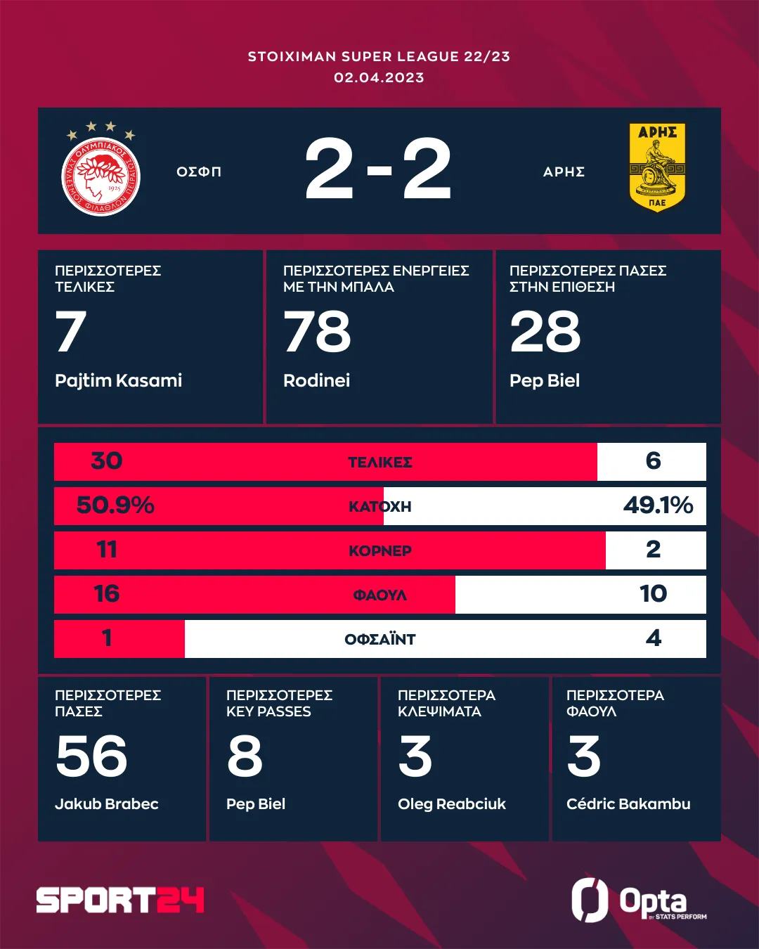 Ολυμπιακός – Άρης 2-2: Ερυθρόλευκο χαρακίρι, πέταξε δύο βαθμούς και την ευκαιρία να πλησιάσει την κορυφή