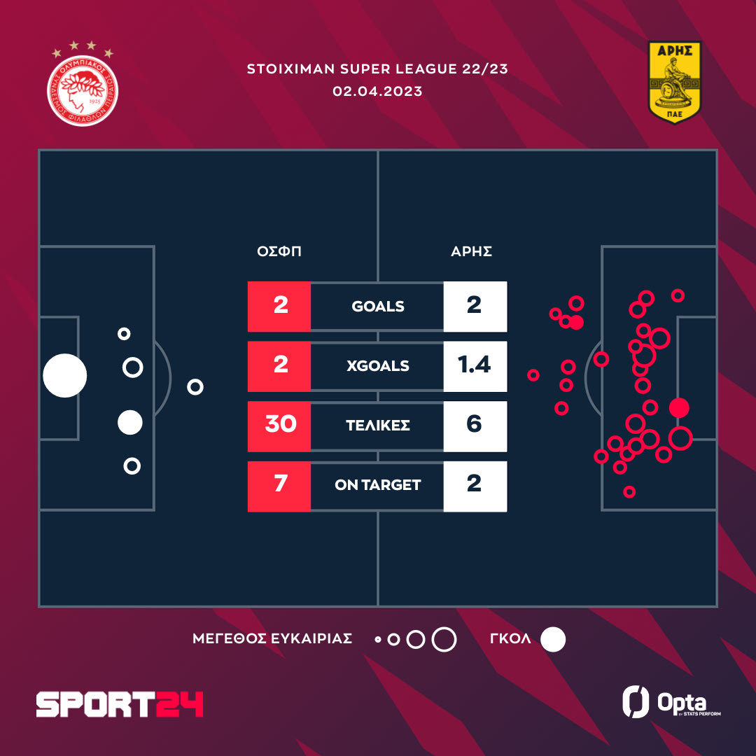 Στη βαθμολογία ο Ολυμπιακός έχει 60 βαθμούς και είναι στο -3 από τον Παναθηναίκό και την ΑΕΚ και έχασε την ευκαιρία να πλησιάσει στην κορυφή. Ο Άρης είναι στους 41 πόντους στην 5η θέση που δίνει ευρωπαϊκό εισιτήριο.