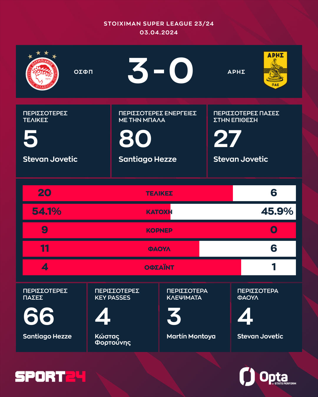 Με αυτή τη νίκη ο Ολυμπιακός έφτασε τους 60 βαθμούς και είναι τρίτος στο -6 από τον πρώτο ΠΑΟΚ. Ο Άρης, από την πλευρά του, παρέμεινε στην 5η θέση με 48 πόντους, πολύ μακριά από την πρώτη τετράδα της βαθμολογίας.