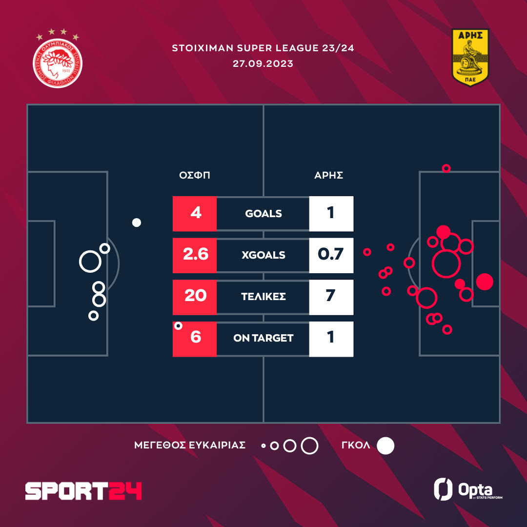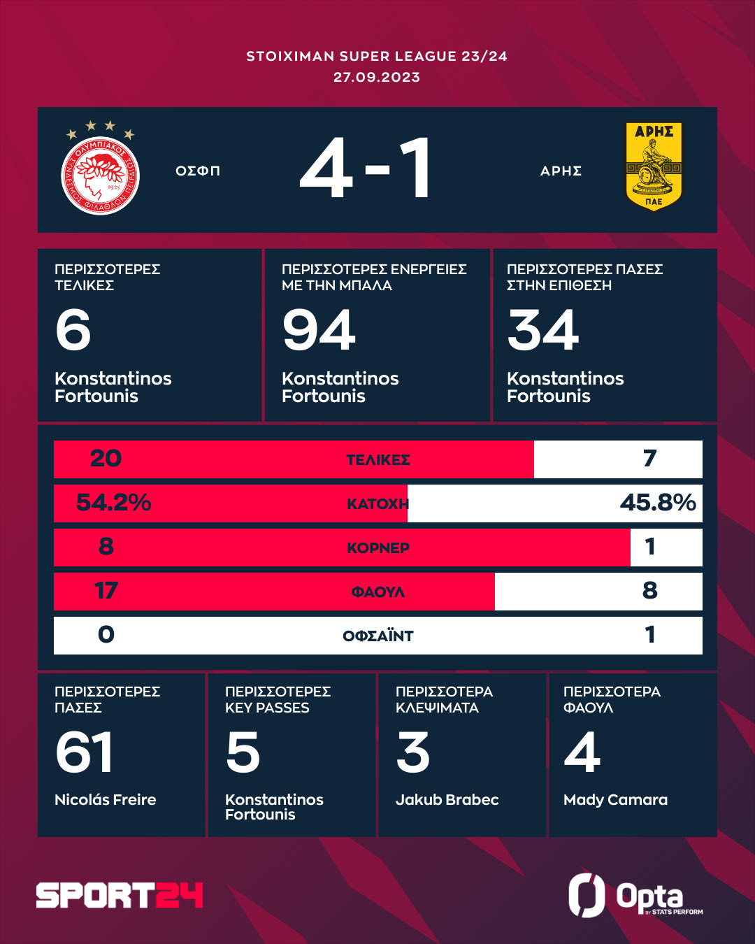 Ο Ολυμπιακός ήταν καταιγιστικός το βράδυ της Τετάρτης (27/9). Οι ερυθρόλευκοι πέρασαν με ευρύ σκορ και το εμπόδιο του Άρη επικρατώντας 4-1 στο Καραϊσκάκης για την 6η αγωνιστική της Stoiximan Super League. Μάλιστα, αυτή ήταν η τέταρτη συνεχόμενη εντός έδρας τεσσάρα των Πειραιωτών στο πρωτάθλημα.