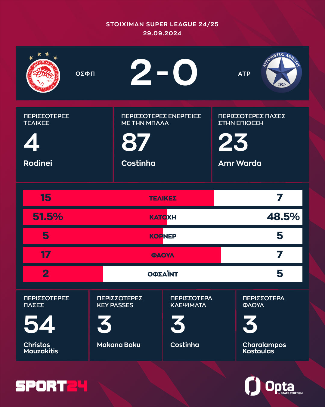 O Ολυμπιακός άφησε πίσω του τα αρνητικά αποτελέσματα, καθώς επικράτησε 2-0 του Ατρομήτου για την 6η αγωνιστική της Stoiximan Super League. Ροντινέι (40') και Ελ Κααμπί (74') τα γκολ, ενώ εντυπωσίασε ο 17χρονος Μουζακίτης, ο οποίος είχε και ασίστ. Βασικός έπαιξε και ο Μπάμπης Κωστούλας.
