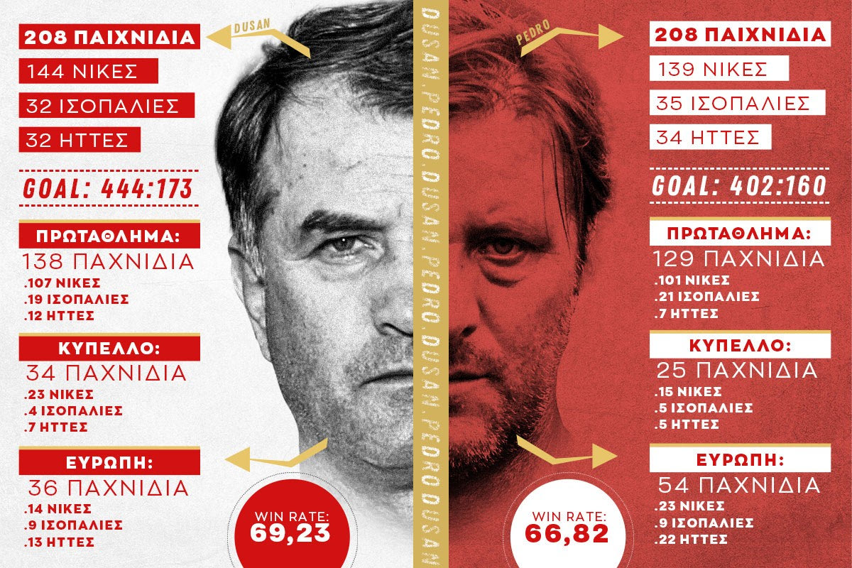 Το παιχνίδι του Ολυμπιακού κόντρα στον Άρη στην πρώτη αγωνιστική των playoffs της Super League Interwetten ήταν ορόσημο για τον Πέδρο Μαρτίνς, καθώς έφτασε τον Ντούσαν Μπάγεβιτς στα 208 ματς στον ερυθρόλευκο πάγκο. Οι δύο τους είναι οι τεχνικοί με τα περισσότερα παιχνίδια ως προπονητές των ερυθρόλευκων.