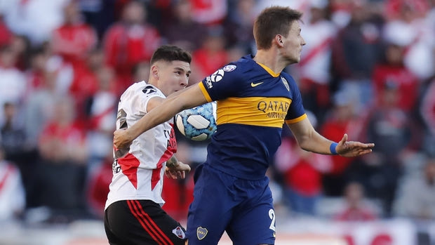 Boca Juniors' Franco Soldano, right, and River Plate's Gonzalo Montiel jump for a header during their Argentine first division soccer game in Buenos Aires, Argentina, Sunday, Sept. 1, 2019. (AP Photo/Natacha Pisarenko)