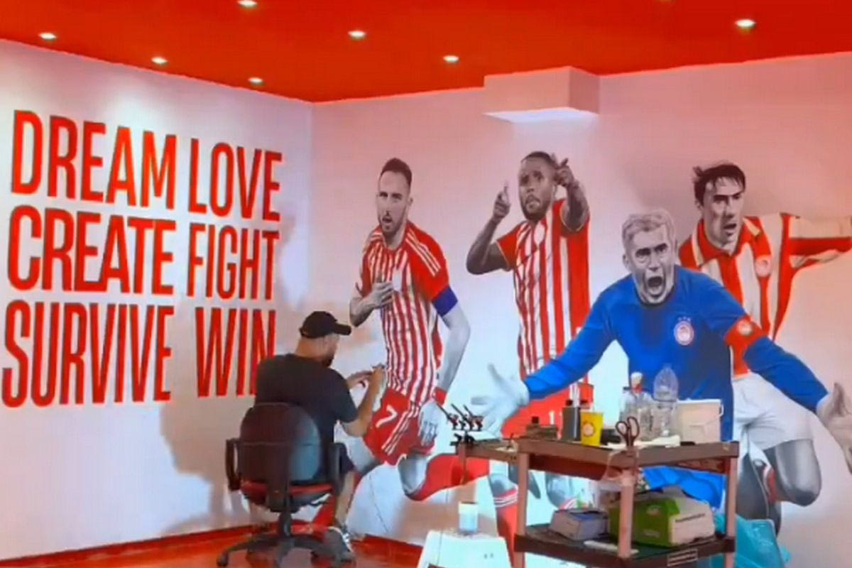Στη νέα τοιχογραφία αποτυπώθηκαν νέοι και παλαιότεροι legends των ερυθρόλευκων, όπως ο Ελ Αραμπί, ο Φορτούνης, ο Βαλμπουενά, ο Αλεξανδρής και ο Αναστόπουλος.