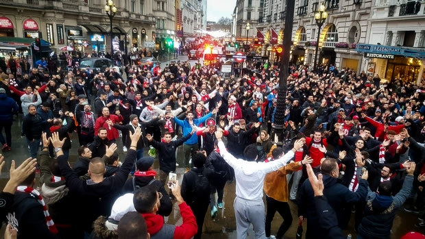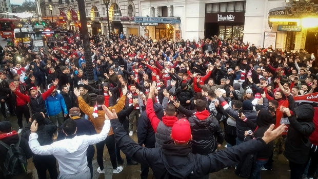 Εκατοντάδες οπαδοί του Ολυμπιακού συγκεντρώθηκαν στο κέντρο του Λονδίνου λίγες ώρες πριν από τη σέντρα του αγώνα με την Τότεναμ και υπό τους ήχους της τρομπέτας έδωσαν "ερυθρόλευκο" χρώμα στη βρετανική πόλη.