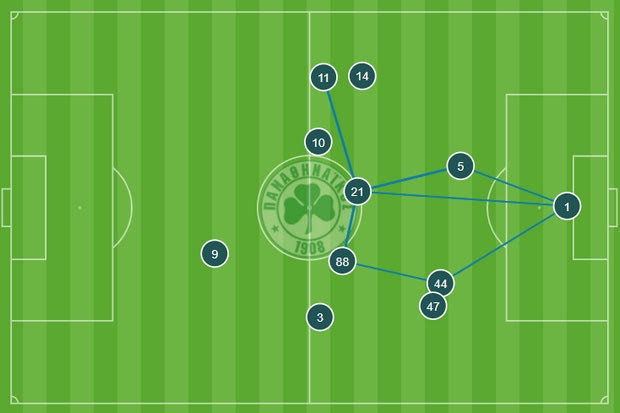 Η πίεση των ερυθρόλευκων είχε τέτοιο αποτέλεσμα που ο Παναθηναϊκός δυσκολευόταν ακόμα και να βγει από την περιοχή του, πόσο μάλλον να περάσει τη σέντρα. Αυτές ήταν οι θέσεις των παικτών του Μπόλονι στο πρώτο ημίχρονο. Οι γραμμές υποδηλώνουν ζευγάρια παικτών που αντάλλαξαν περισσότερες από τρεις πάσες μεταξύ τους.