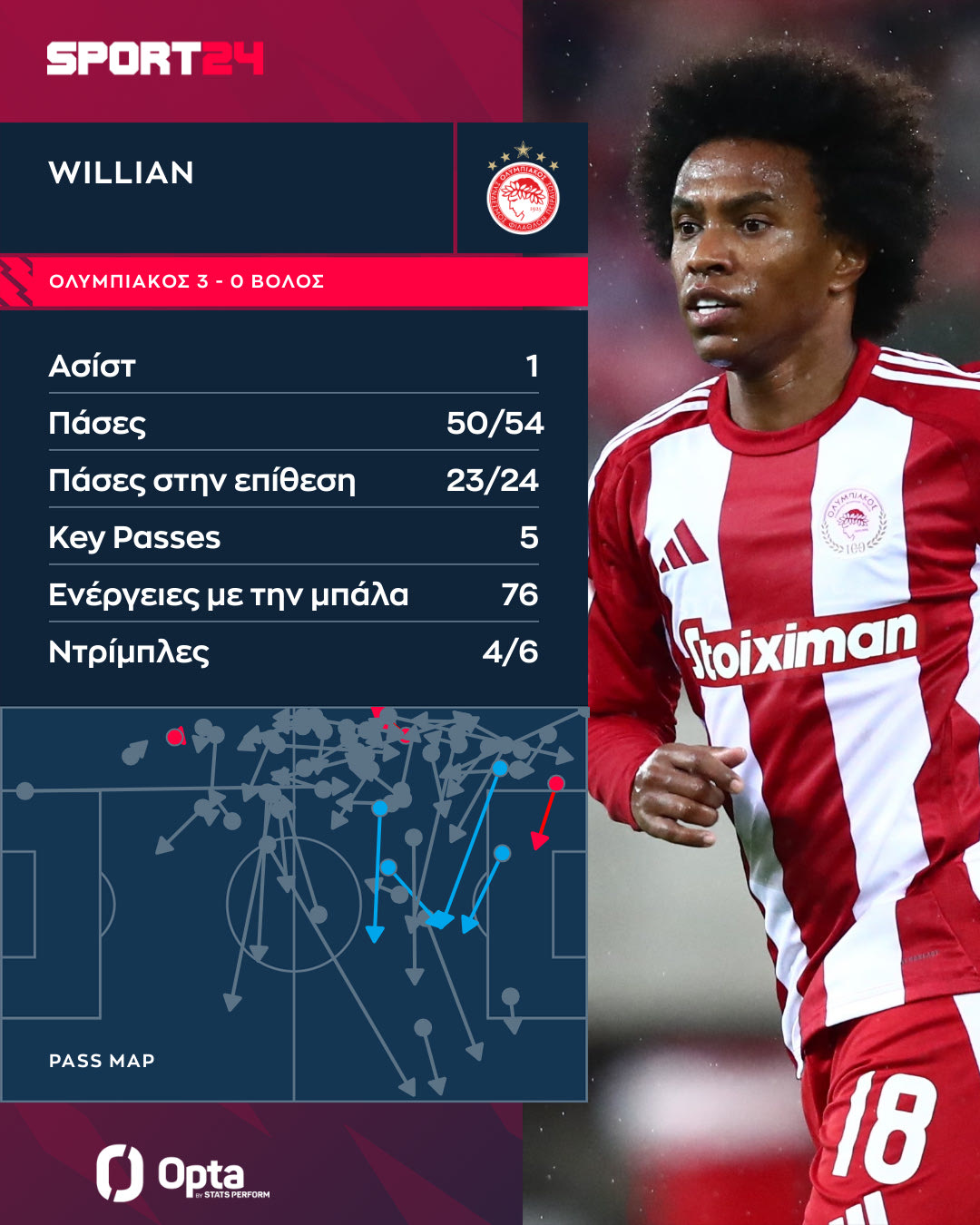 Ο Γουίλιαν κινήθηκε στην αριστερή πλευρά και μάλιστα ήταν από τους πιο δραστήριους ποδοσφαιριστές του Ολυμπιακού με 76 ενέργειες. Για την ακρίβεια ήταν ο πιο δραστήριος μεσοεπιθετικός των ερυθρόλευκων.