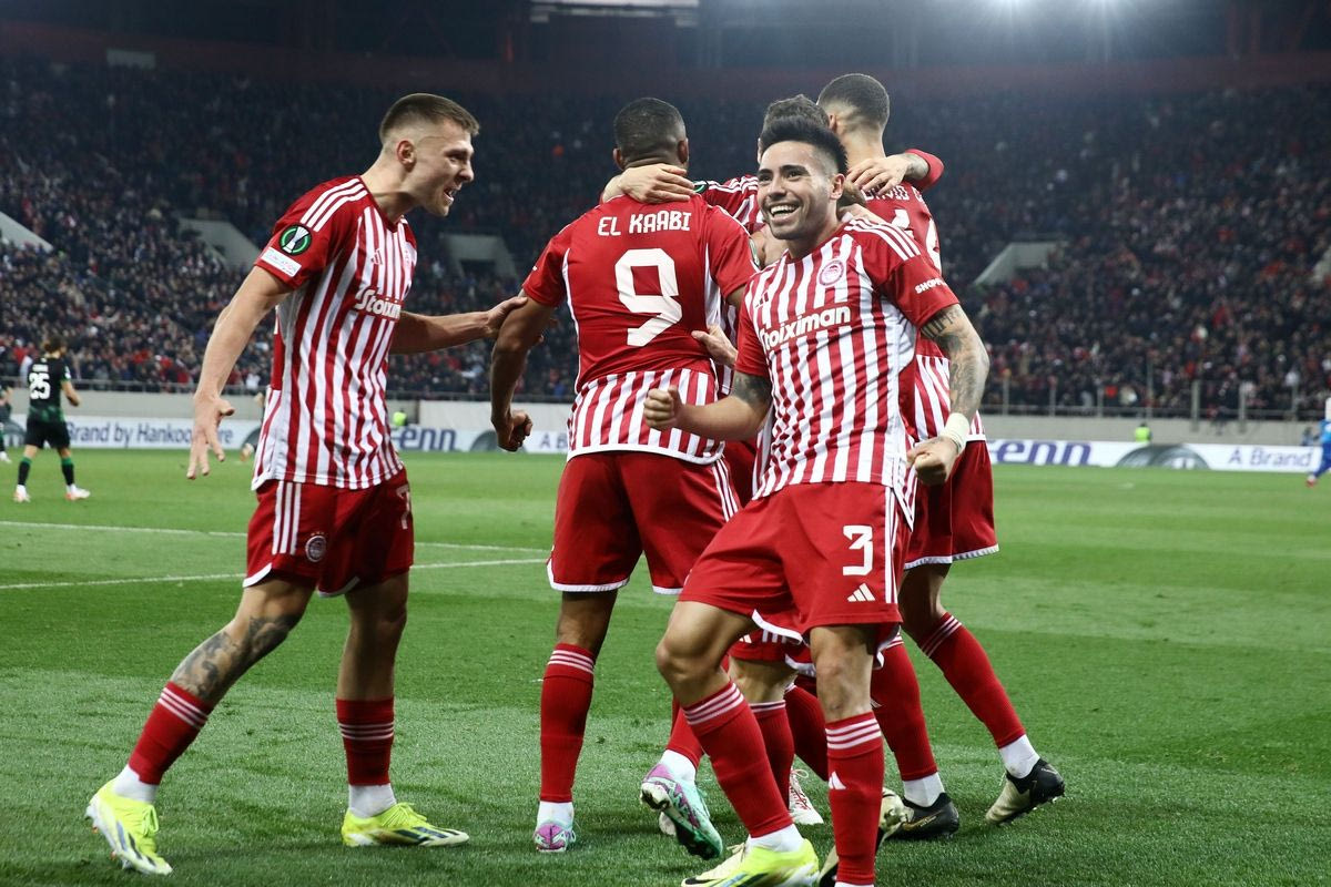Οι παίκτες του Ολυμπιακού πανηγυρίζουν το γκολ του Ελ Κααμπί στο ματς με τη Φερεντσβάρος