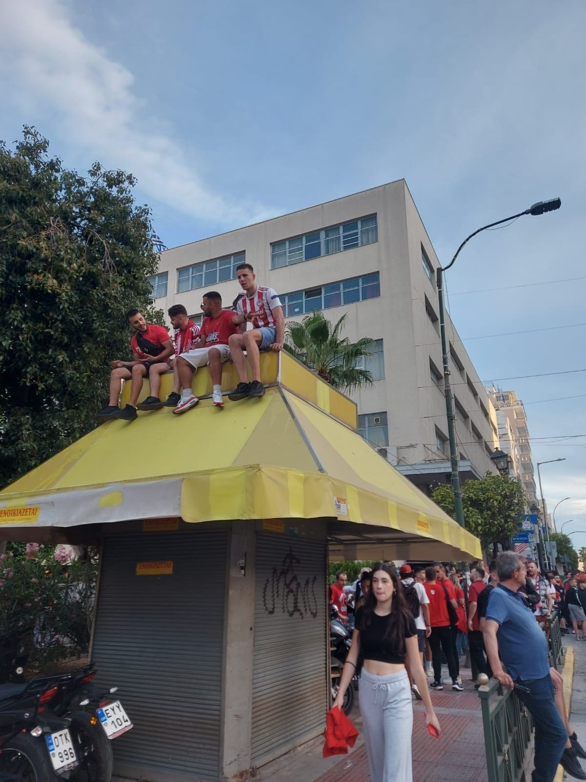 Οι οπαδοί του Ολυμπιακού κατέκλυσαν το χώρο έξω από το Δημοτικό Θέατρο Πειραιά για να δουν τον τελικό με την Φιορεντίνα μέσα από γιγαντοοθόνη, με κάποιους πιο ευρηματικούς να σκαρφαλώνουν στην οροφή περιπτέρου για να έχουν καλύτερη θέα.