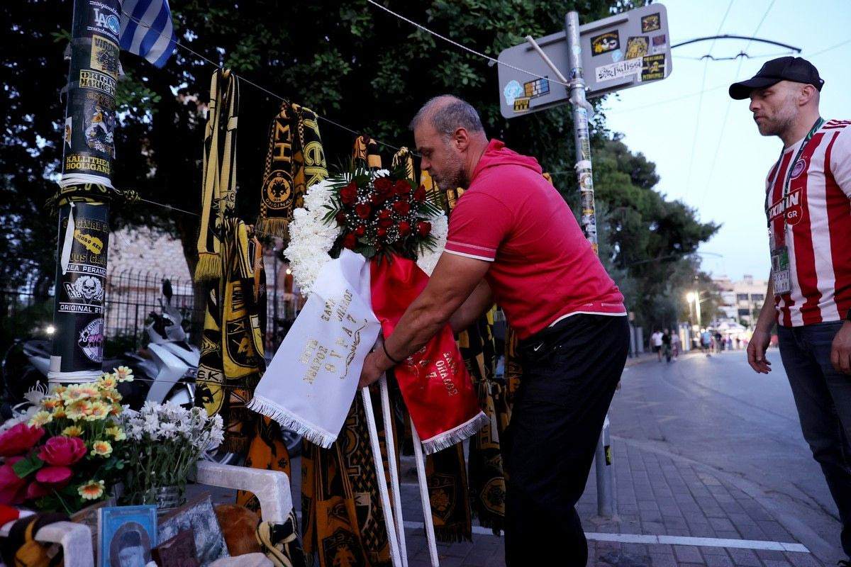 Φίλοι του Ολυμπιακού κατά την έλευση τους στην OPAP Arena για τον τελικό με την Φιορεντίνα άφησαν στεφάνι μπροστά από το μνημείο στη μνήμη του αδικοχαμένου Μιχάλη Κατσουρή.