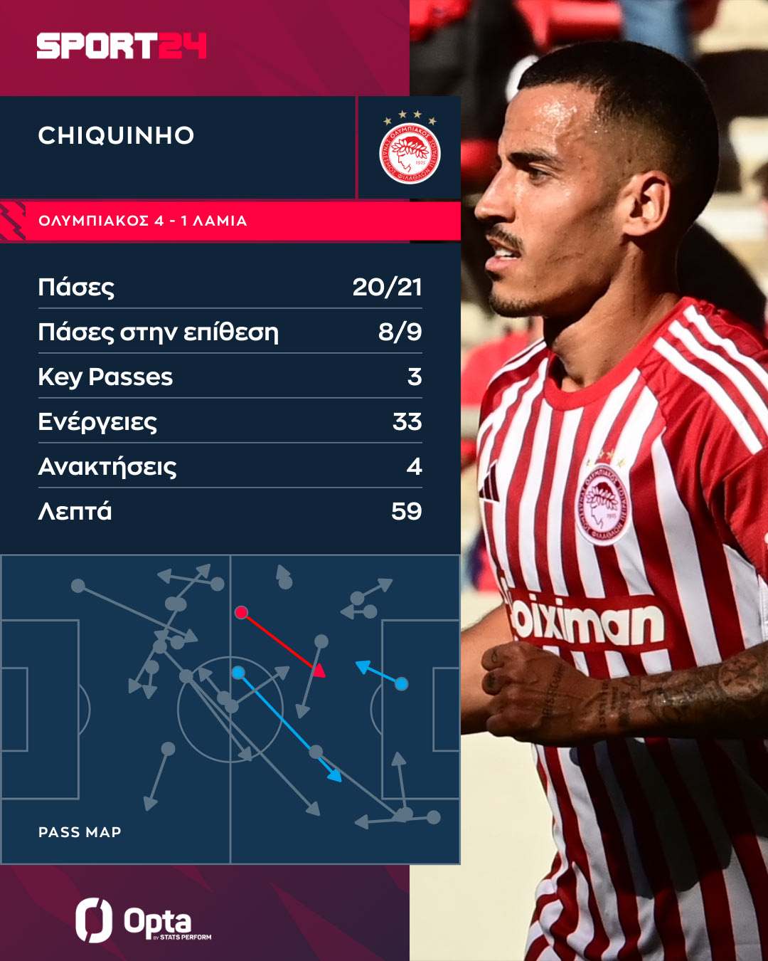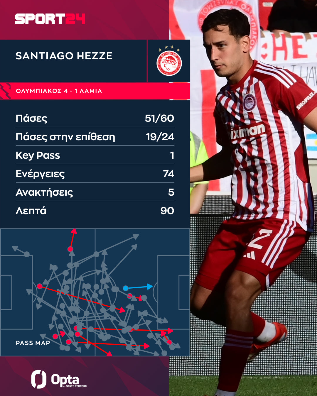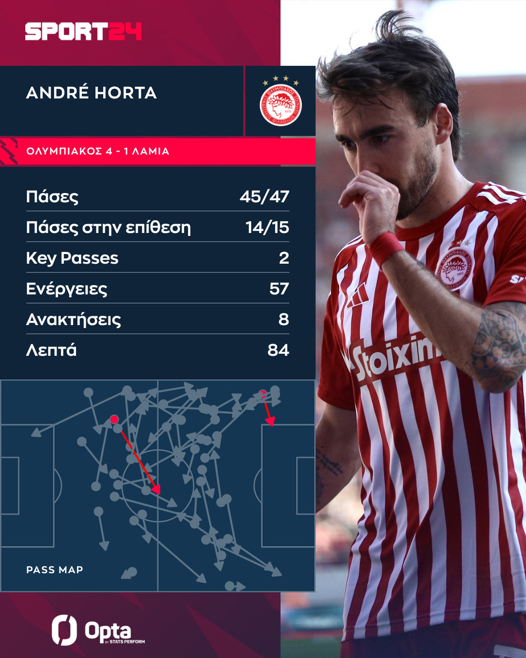 Στο γράφημα της Opta/Stats Perform μπορείτε να δείτε τις μεταβιβάσεις του Αντρέ Όρτα στα 84 λεπτά που έπαιξε απέναντι στη Λαμία.