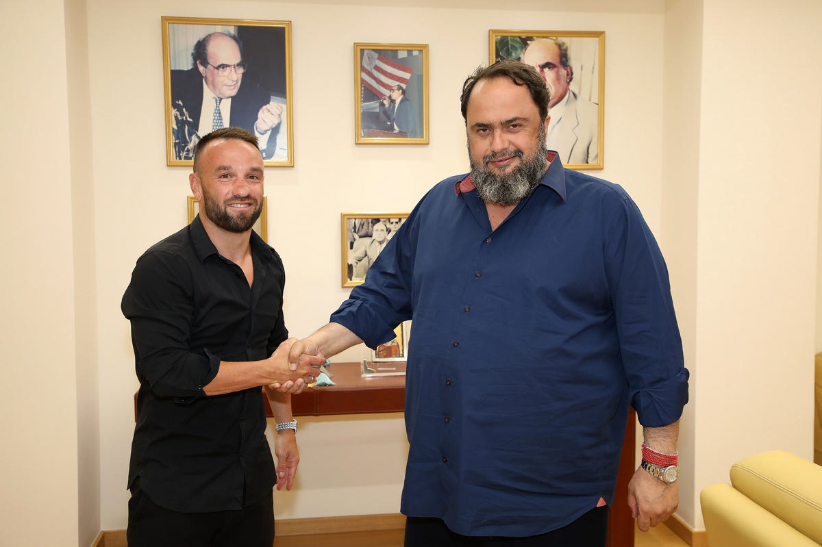 Ο Ματιέ Βαλμπουενά με τον Βαγγέλη Μαρινάκη κατά την υπογραφή του συμβολαίου του στον Ολυμπιακό