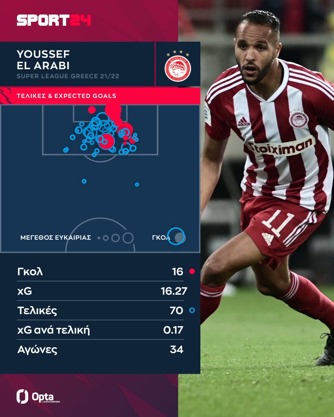 Στην πρώτη του σεζόν στον Ολυμπιακό, ο Μαροκινός επιθετικός είχε πετύχει 20 γκολ στο πρωτάθλημα, τα δύο εξ αυτών με πέναλτι. Είχε 72 τελικές με “αξία” 15.29xG και 13.71xG, χωρίς να υπολογίζουμε τα πέναλτι.