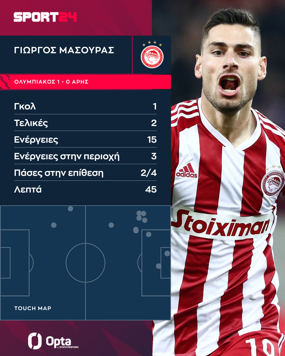 Ο Ολυμπιακός επικράτησε 1-0 του Άρη με τον Γιώργο Μασούρα να πετυχαίνει στο 46ο λεπτό το νικητήριο γκολ στην πρώτη του ενέργεια με την μπάλα. Ήταν ο απόλυτος game changer, σ' ένα ματς που εξιλεώθηκε.