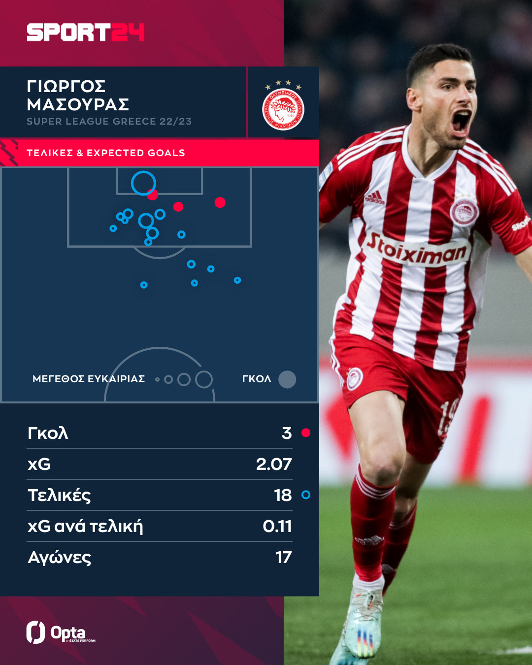 Στο παρακάτω γράφημα της Opta/Stats Perform μπορείτε να δείτε όλες τις τελικές και τα γκολ του Γιώργου Μασούρα στα παιχνίδια του στη Super League.