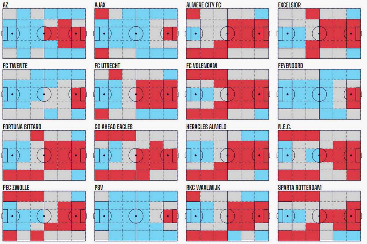 Δείτε στο γράφημα της Opta/Stats Perform την εικόνα που είχε φέτος η Άλκμααρ. Με γαλάζιο χρώμα απεικονίζονται οι χώροι του γηπέδου όπου μία ομάδα έχει περισσότερες επαφές. Με κόκκινο είναι οι χώροι που κυριαρχεί ο αντίπαλος και με γκρι τα σημεία που είναι μοιρασμένα.