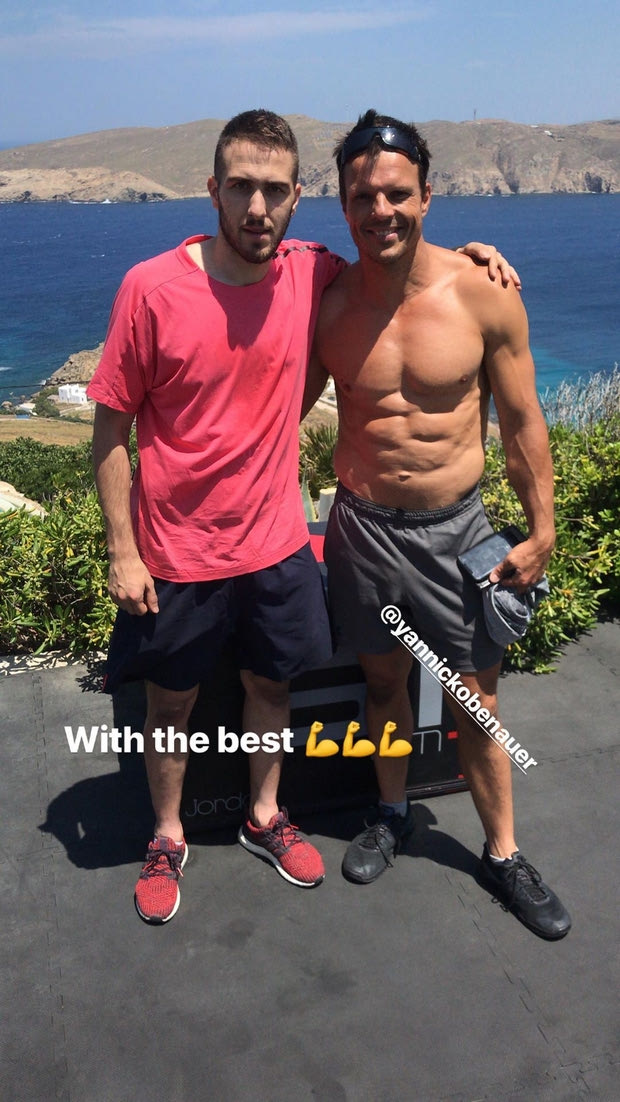 Ο αρχηγός του Ολυμπιακού, Κώστας Φορτούνης, δημοσίευσε φωτογραφία με τον Γερμανό αθλητικό επιστήμονα, Γιανίκ Ομπενάουερ, από τη Μύκονο όπου γυμνάζεται ενόψει της νέας σεζόν.