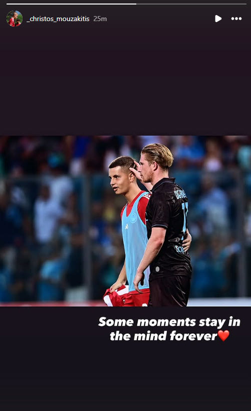 Μία φωτογραφία με τον Κέβιν Ντε Μπρόινε ανέβασε ο Χρήστος Μουζακίτης στο Instagram, έπειτα από την αναμέτρηση Νάπολι – Ολυμπιακός.