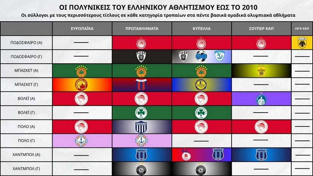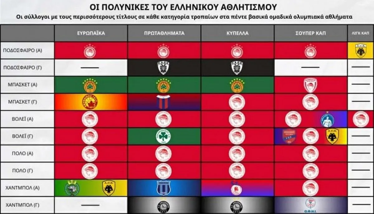 Κάπως έτσι, ο Ολυμπιακός έφτασε τους 342 τίτλους σε ομαδικά αθλήματα, επιβεβαιώνοντας γιατί είναι ένας από τους κορυφαίους πολυαθλητικούς συλλόγους της Ευρώπης. Πριν από λίγες ημέρες, με αφορμή την συμπλήρωση των 101 χρόνων ιστορίας τους, οι ερυθρόλευκοι παρουσίασαν τον πίνακα με τους πολυνίκες ελληνικούς συλλόγους.