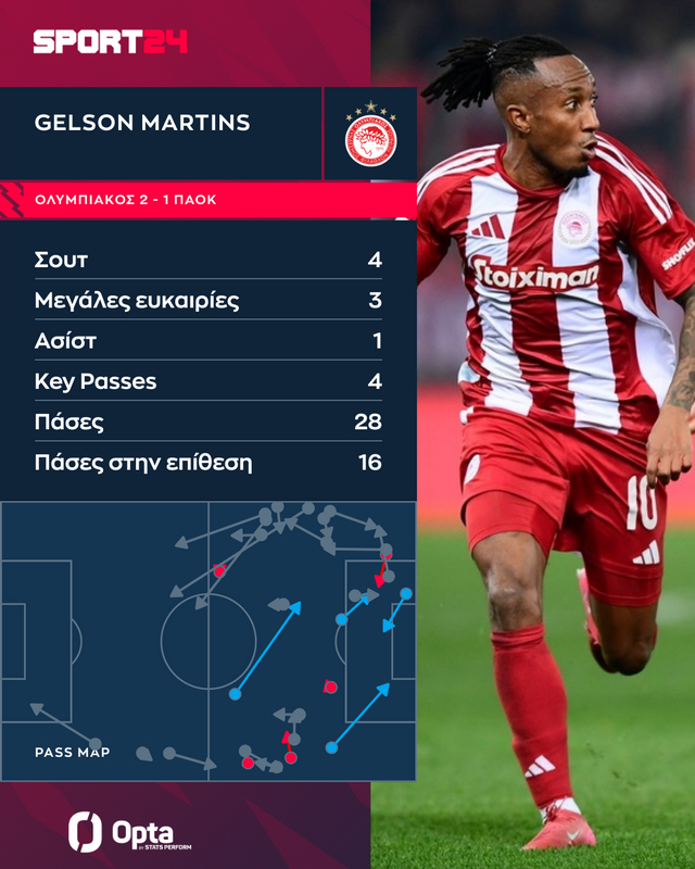 Ο Ολυμπιακός είχε αρκετούς πρωταγωνιστές στο ντέρμπι με τον ΠΑΟΚ, με τον Ζέλσον Μαρτίνς να είναι ένας εξ’ αυτών. Ο 29χρονος εξτρέμ έπιασε την κορυφαία επίδοση σε δημιουργία ευκαιριών στο φετινό πρωτάθλημα, ενώ δεν υστέρησε σε κανένα κομμάτι στο τελευταίο τρίτο του γηπέδου.