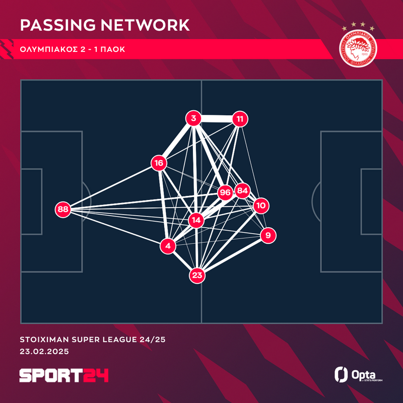 Ο Πορτογάλος ξεκίνησε στο δεξί “φτερό” της επίθεσης των Πειραιωτών, όμως δεν περιορίστηκε εκεί. Όπως διαφαίνεται στο γράφημα της Opta Stats / Perform με το passing network των παικτών του Ολυμπιακού, ο Ζέλσον Μαρτίνς (με το Νο10) κινήθηκε κεντρικά, κοντά στον Μπάμπη Κωστούλα, με τον Ελ Κααμπί να έχει πατήματα πιο δεξιά στο γήπεδο.
