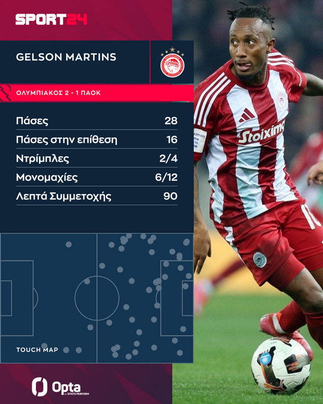 Η προσφορά του Μαρτίνς στην επιθετική λειτουργία του Ολυμπιακού ήταν πολυδιάστατη. Πέρα από τη δημιουργία και την εκτέλεση, ο Πορτογάλος είχε και 4 ντρίμπλες, με τις 2 από αυτές να είναι επιτυχημένες, ενώ “μπήκε” και σε 12 μονομαχίες κερδίζοντας τις 6 από αυτές συμβάλλοντας καταλυτικά στην ανάκτηση αλλά και τη διατήρηση της μπάλας για την ομάδα του Πειραιά.