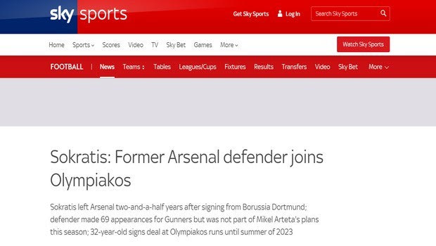 SKY SPORTS: ΣΤΟΝ ΟΛΥΜΠΙΑΚΟ Ο ΤΕΩΣ ΑΜΥΝΤΙΚΟΣ ΤΗΣ ΑΡΣΕΝΑΛ