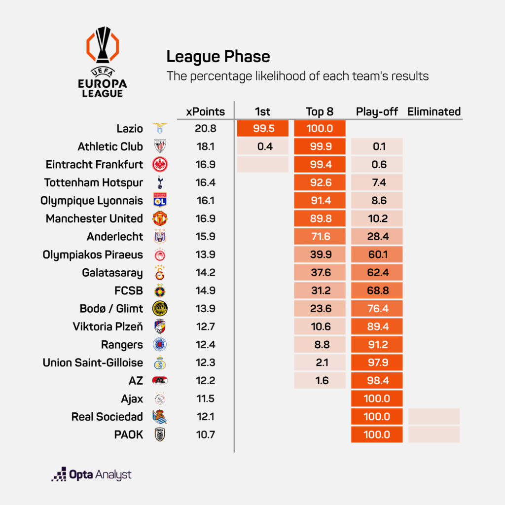 Σύμφωνα με την Opta, παρά το γεγονός πως οι Πειραιώτες βρίσκονται στη 12η θέση, είναι πιθανότερο να τερματίσουν στην πρώτη 8αδα, απ’ ότι ομάδες που τους προσπερνούν. Συγκεκριμένα, ο Ολυμπιακός έχει ποσοστό 39,9 % να πετύχει τον στόχο του, περισσότερες δηλαδή απ’ ότι η Γαλατασαράι (37,6 %), η Μπόντο Γκλιμτ (23,6%), ακόμη και η Στεάουα (31,2%), που είναι τώρα 8η. Για την ακρίβεια, σύμφωνα με την Opta, ο Ολυμπιακός είναι η επικρατέστερη ομάδα για να τερματίσει στην 8η θέση.