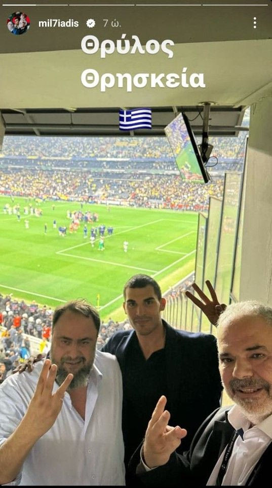Την πρόκριση πανηγύρισε και ο Βαγγέλης Μαρινάκης μαζί με τον γιο του Μιλτιάδη που ανέβασε μια φωτογραφία τους μαζί με τον Σωκράτη Κομινάκη, γράφοντας, “Θρύλος, Θρησκεία” και την ελληνική σημαία.